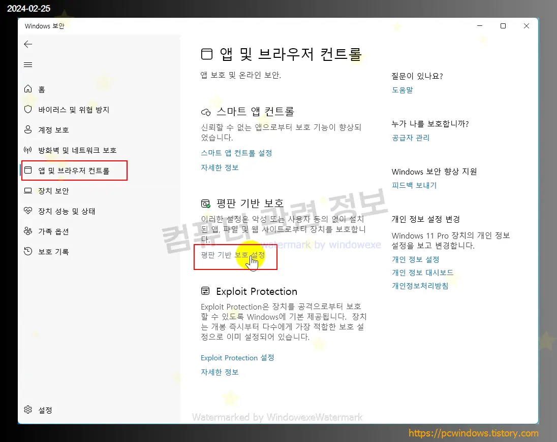 앱 및 브라우저 컨트롤로 이동해서 평판 기본 보호 설정 클릭