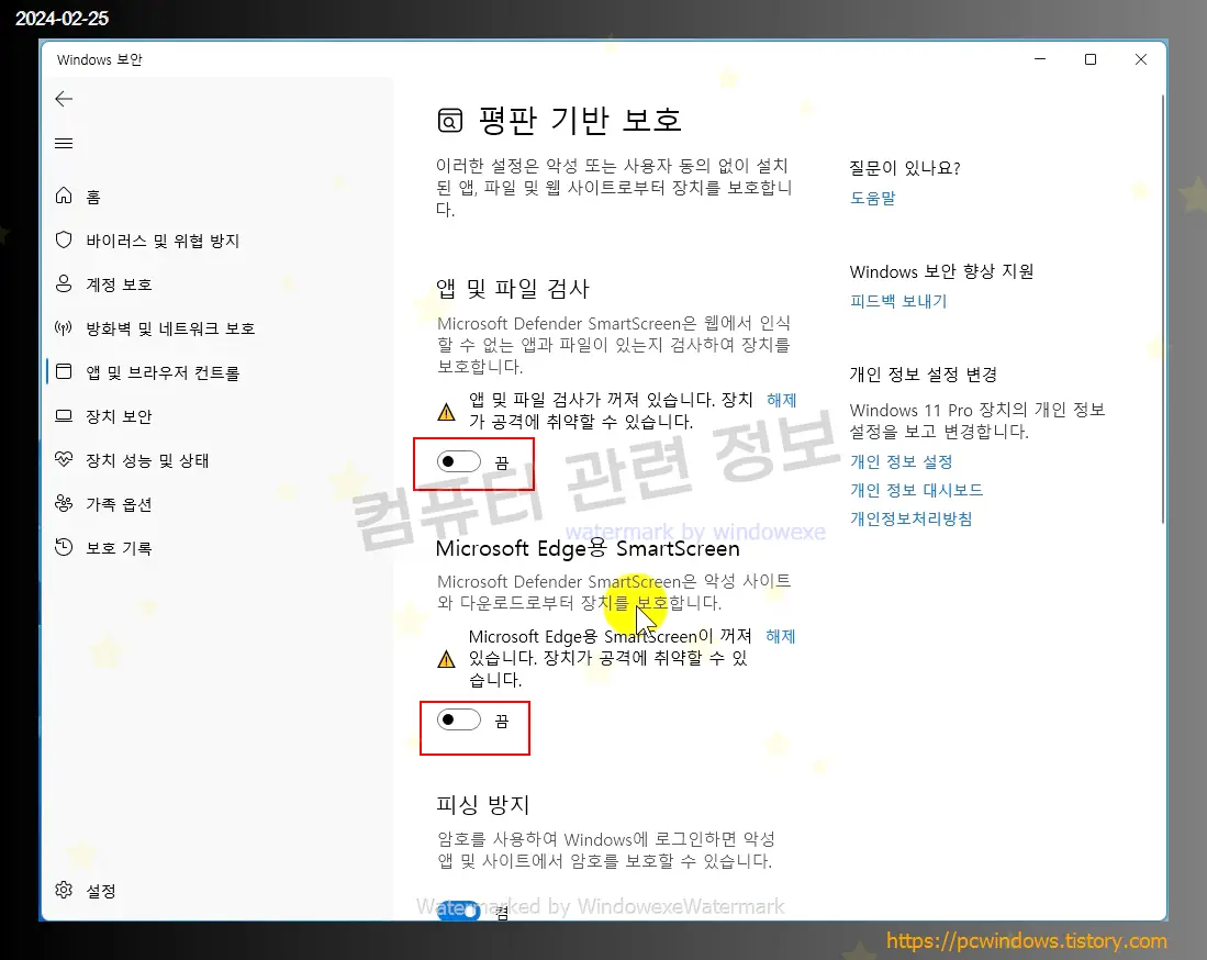 앱 및 파일 검사, Microsoft Edge용 SmartScreen 이 켜져 있으면 모두 끔으로 변경하세요.
