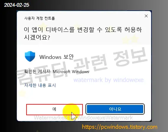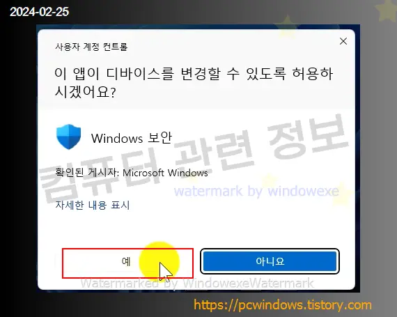 사용자 계정 컨트롤 메세지가 나오는데 예 클릭.