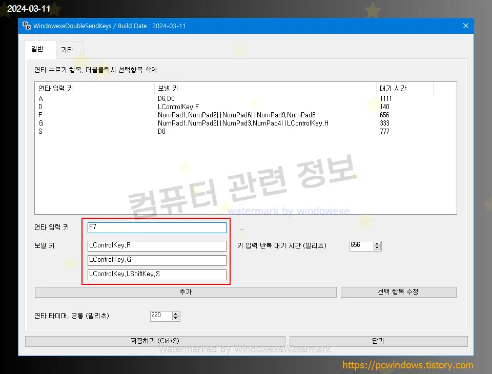 특수키 조합으로 사용하는 경우 오동작을 하는 경우가 있으니 조합 키는 일반 키 조합으로만 사용하고 보낼 키도 단일키로만 사용하세요.